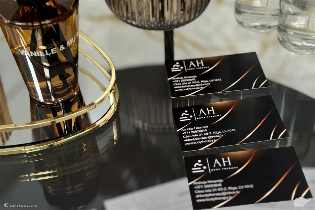 Masāžas studija “AH Body Therapy” Rīgā, Barona Kvartālā, piedāva profesionālu medicīnisko (ārstniecisko) masāžu, sporta un klasisko masāžu, celulīta ārstēšanu un ķermeņa apjomu samazināšanu ar VELASHAPE aparātu kā arī RF (radiofrekvenču) sejas liftinga procedūru. Šim nolūkam masāžas studijā ir moderns aprīkojums un visi nepieciešamie apstākļi Jūsu komfortam.