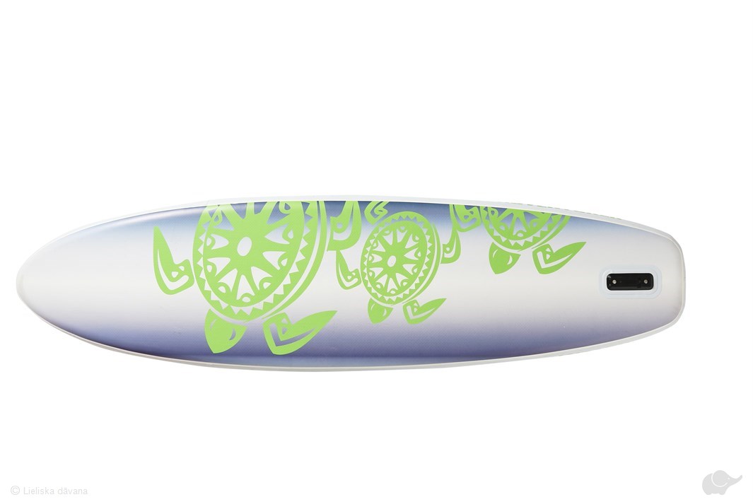 SUP dēlis ir 150 mm biezs – tas nodrošinās teicamu vadāmību un stabilitāti uz ūdens. Dēļa virskārta pārklāta ar mīkstu un ērtu pārklājumu, nodrošinot airētāja pēdām komfortu un lielisku saķeri ar SUP dēli. Gumiju kravas sistēma nodrošinās labāku un stingrāku bagāžas novietošanu uz SUP dēļa.