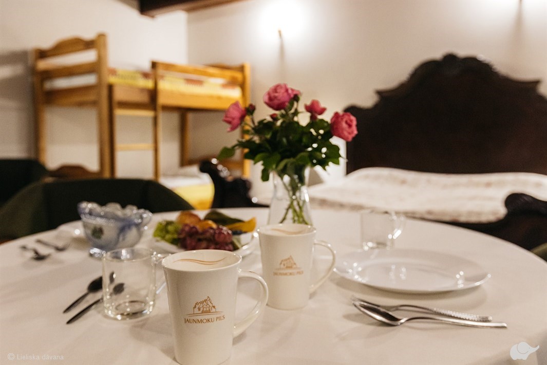 Lieliska dāvana ģimenei – aktīva, interesanta un izzinoša atpūta Jaunmoku pils kompleksā. Ģimene varēs pavadīt laiku Dīķa mājas ģimenes numurā ar brokastīm 4 personām, kur numuriņš ir iekārtots ērti un mājīgi, ar virtuves stūrīti, TV, dušu un WC. Brokastis baudāmas blakus esošajā Muižas ēkā. Piedāvājumā arī Jaunmoku pils muzeja apmeklējums, kurā var aplūkot Meža muzeja izglītojošo ekspozīciju un uzkāpt 20 m augstajā tornī, lai apbrīnotu apkārtni un Kurzemes pakalnus. Ģimenes piedzīvojums turpināsies izlaušanās spēlē "Zaļā meža melnie stāsti“, kur būs jārisina uzdevumi, lai izglābtu meža iemītniekus. Vēl ir iespēja izvēlēties orientēšanās spēli, kā arī izbrauciens ar laivu pils dīķī vai pastaiga sniega čībās. Papildu piedāvājums – Laimes monētas kalšana un Jaunmoku pils kompliments numurā.