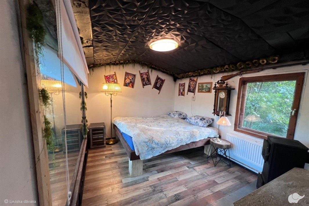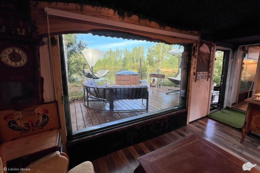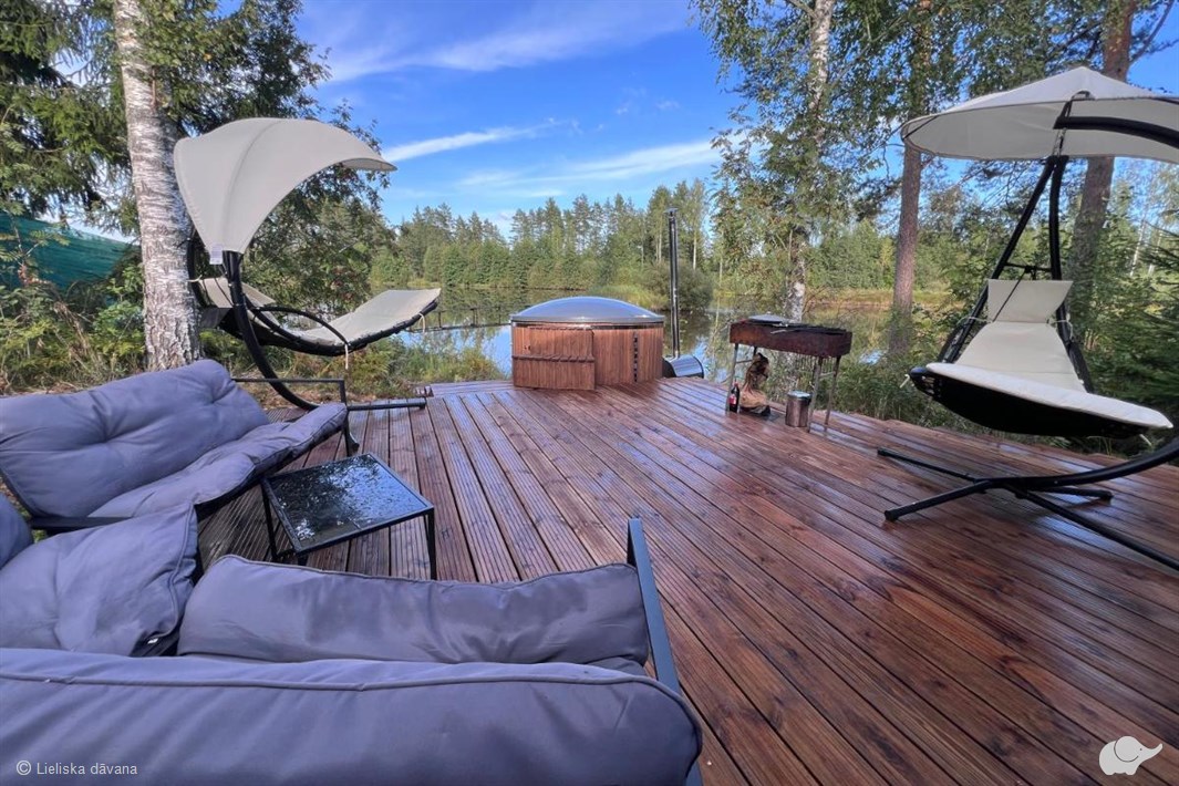 • nakts meža mājiņā pie ezera, ar plašu āra terasi, aprīkotu virtuvi un visām ērtībām (līdz 4 pers.);