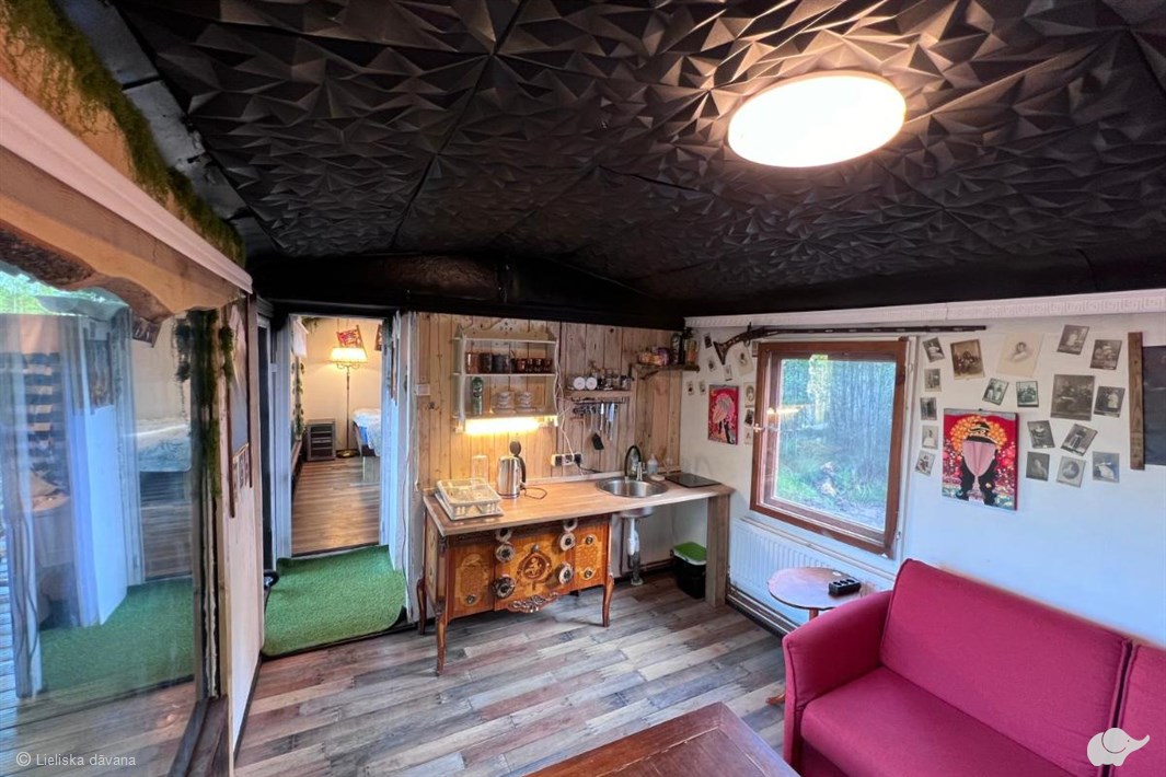 Namiņam ir viena guļamistaba ar divguļamo gultu, kā arī dīvāngulta dzīvojamā istabā, maltītes pagatavošanai piemērota virtuves zona, apsildīšana un vannasistaba. Āra terasē atrodas vairāki atpūtas krēsli un grils maltītes gatavošanai. Šī atpūta Jums dāvās neaizmirstamas brīvdienas ar ģimeni vai draugiem, baudot pavisam nesteidzīgu mieru vai aktīvi izzinot maģisko apkārtni. Blakus namiņam un tuvumā ir ezeri un meži, ļaujot Jums makšķerēt, sēņot, ogot un doties garās pastaigās. Naktī no terases paveras iespaidīgs skats uz zvaigžņotu debesi, ko pavisam neaizmirstamu padarīs, ja izbaudīsiet, kamēr sildāties kublā.