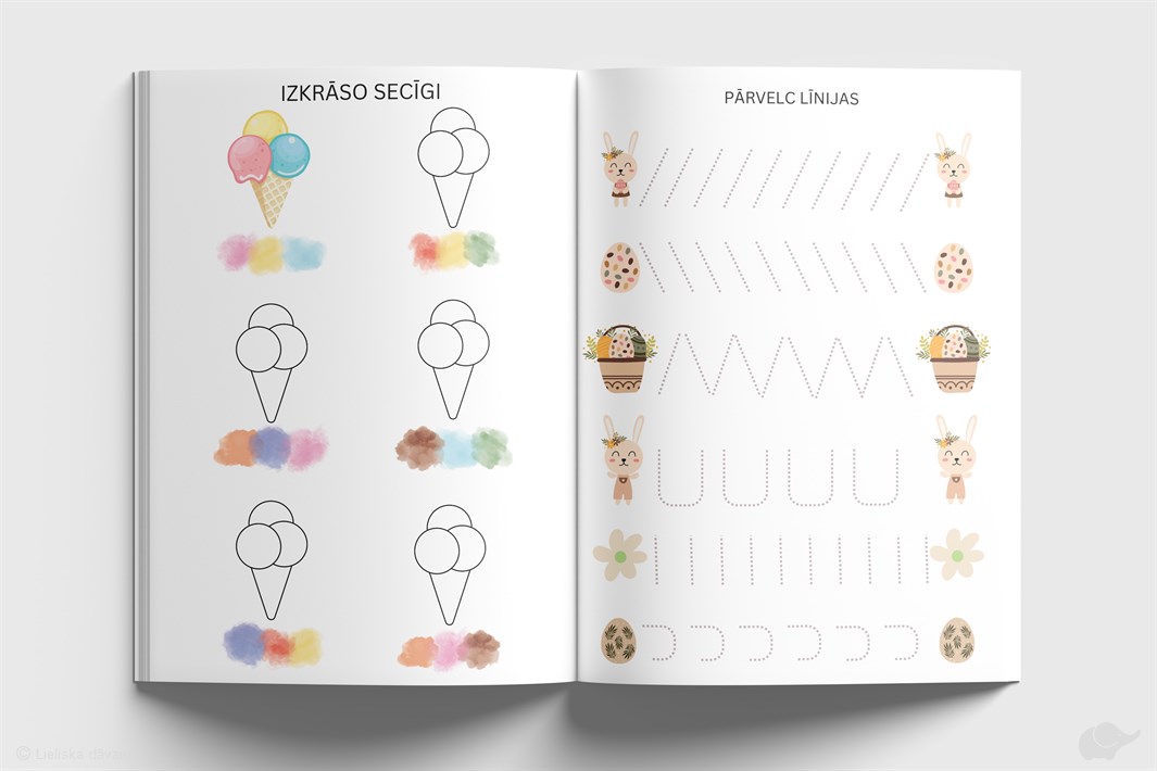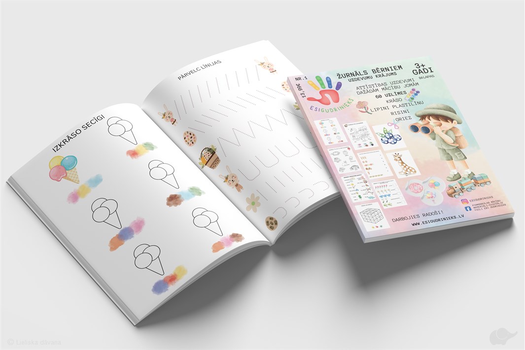 Krāsot, griezt, lipināt un risināt – ar šiem uzdevumiem Jūs pilnveidosiet bērnu sīkās motorikas un domāšanas attīstīšanai tik svarīgās prasmes, pavadot vērtīgu laiku kopā vai ļaujot bērnam darboties patstāvīgi. Vēl jo vairāk – ekrānu pārsātinātajā laikmetā uzmanības noturēšana, bagāts redzesloks un spēja patstāvīgi paveikt uzdevumus par matemātikas, latviešu valodas, dabaszinību, mākslas un citām tēmām ir prasmes, par kurām priecāsies ikviens bērnudārza un pirmsskolas posma bērna tuvinieks un pedagogs, bet vislielākais ieguvējs būs tieši pats bērns.