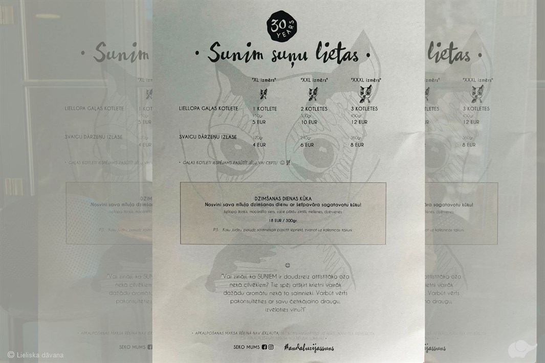 Tieši tā – suņiem suņu lietas! Liellopa gaļas kotlete, cepta vai jēla – kā Jūsu lolojumam labāk tīk, svaigu dārzeņu izlase un pat dzimšanas dienas kūka – restorāna “Andalūzijas suns” ēdienkarte suņiem iepriecinās pat visprasīgākos kārumniekus. Mmm, cik gardi, vau, vau! Lieliska dāvana visiem suņu saimniekiem, lai vairs nebūtu jāskumst restorānā, ilgojoties pēc mājās atstātā labākā drauga.