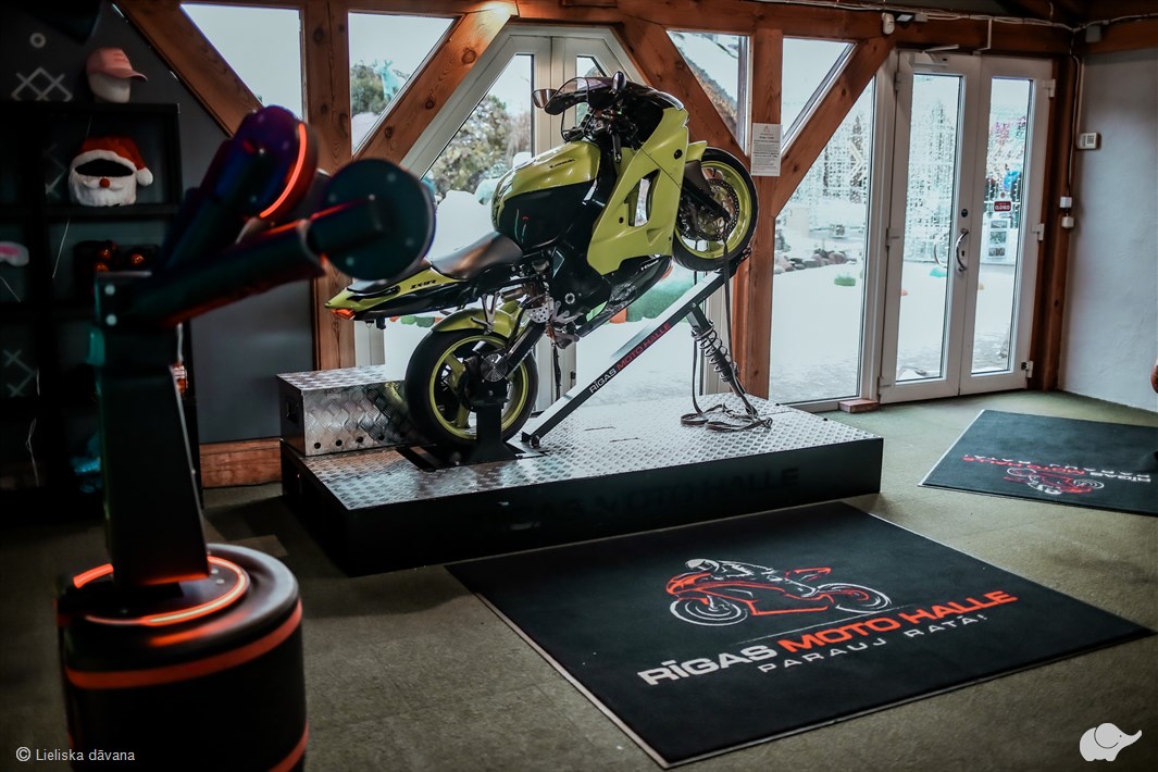 “Rīgas Moto Halle” jums būs Baltijā unikāla iespēja iekštelpās izmēģināt braukšanu uz motocikla aizmugurējā riteņa jeb “raut ratā” (wheelie) īstu superbaiku! Izklaidei pieejams Kawasaki ZX6 Ninja aprīkots ar jaudīgu elektromotoru un droši lietojams telpās. Otrs piedzīvojums jūs sēdinās uz satrakota mehāniskā Rodeo buļļa – mēģiniet to savaldīt, kad dažādos ātrumos un pakāpēs tas griezīsies uz visām pusēm, imitējot īstas Rodeo sacensības!