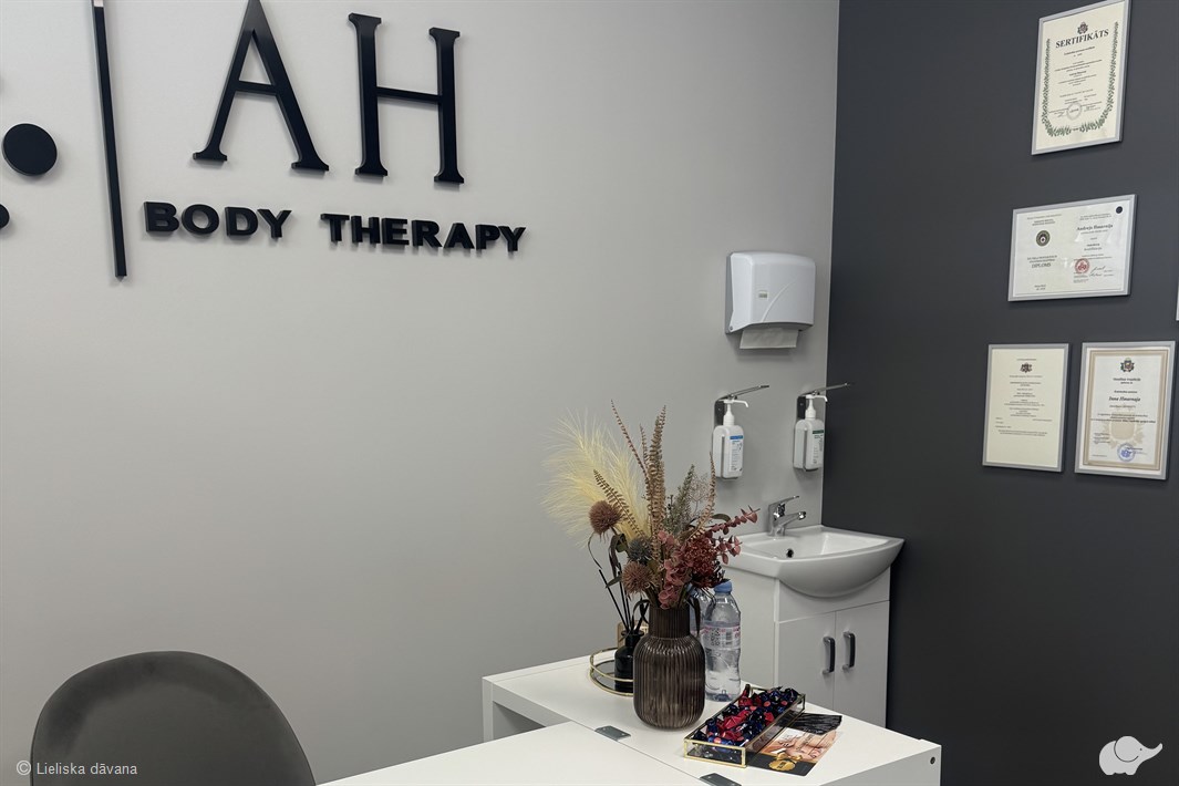 Ārstniecības iestāde “AH Body Therapy” Rīgā, Barona Kvartālā, piedāvā ārstnieciskās masāžas, rehabilitācijas pakalpojumus, sejas un ķermeņa neķirurģiskas vecuma izmaiņu korekcijas metodes, kā arī profesionālus kosmetoloģijas pakalpojumus. Medicīniska pieeja, moderns aprīkojums, nozares profesionāļi nodrošina visus nepieciešamos apstākļus klientu komfortam.