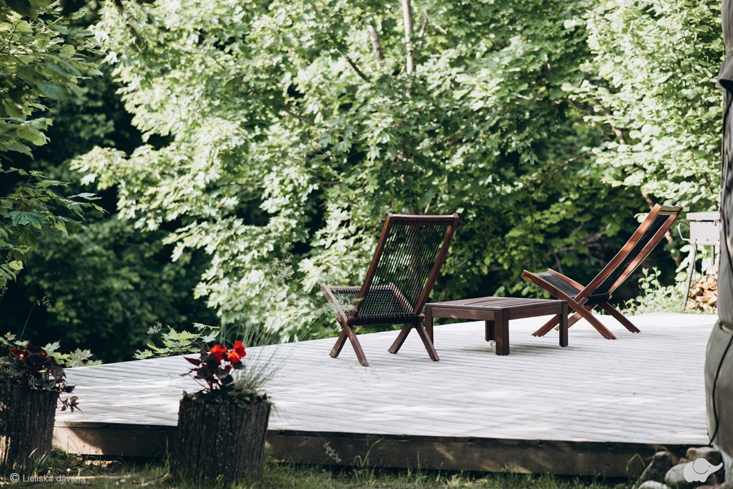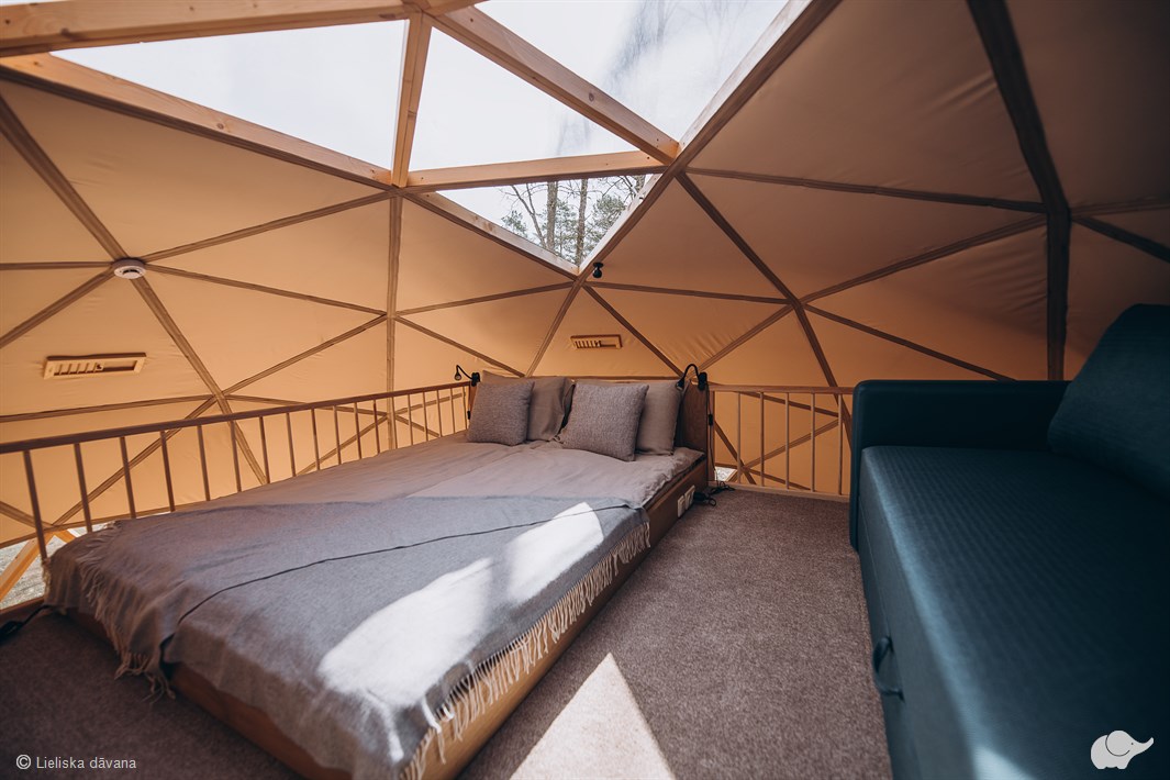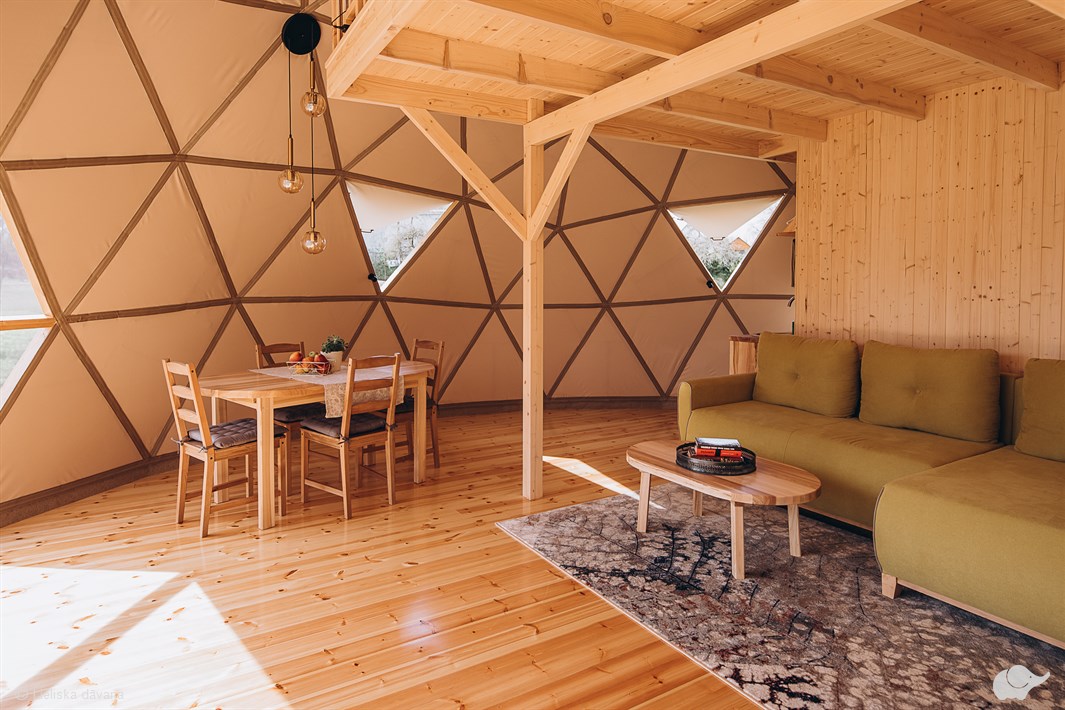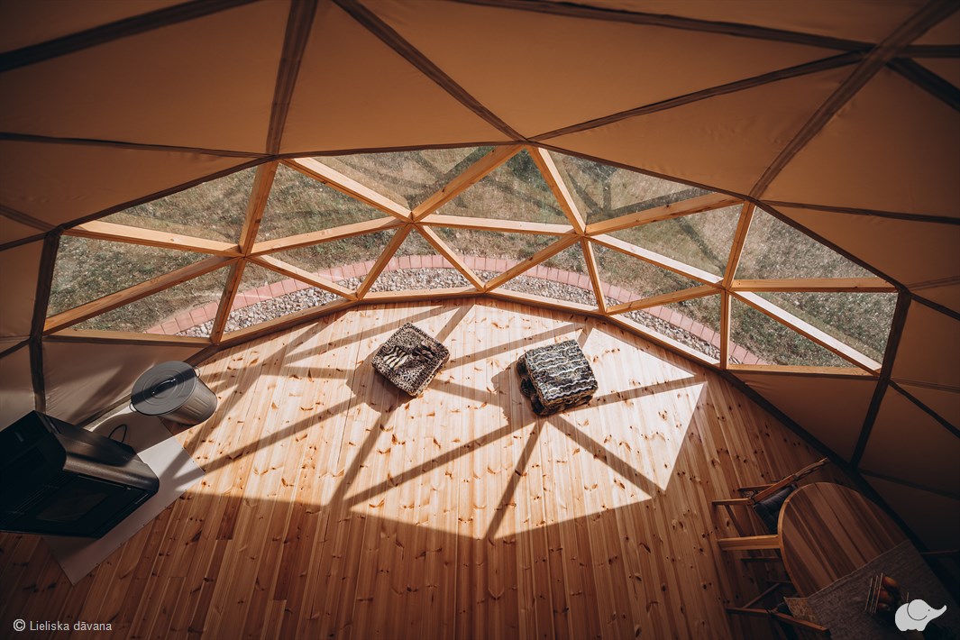 "Jurta" ir 50 m2 vienstāvu māja, unikāla savā konstrukcijā, kurā apvienots koka karkass, aitas vilnas filcs un elpojošs pārklājums. Pateicoties šai konstrukcijai, jūs varat justies kā neliela daļa no dabas – dzirdēt putnu čivināšanu, krītošas lietus lāses vai pūces dūkoņu naktī, kā arī apbrīnot skatu uz upi no terases. Visa māja ir koplietošanas telpa ar guļamzonu un atpūtas zonu, virtuvīti un atsevišķu istabu ar dušu un tualeti. "Lielais kupols" ir 50 m2 māja ar skatu uz kūrortu. Pirmajā stāvā atrodas duša, atpūtas zona un pusdienu galds. Otrajā stāvā viesi atradīs divguļamo gultu un izvelkamo dīvānu nakts atpūtai.