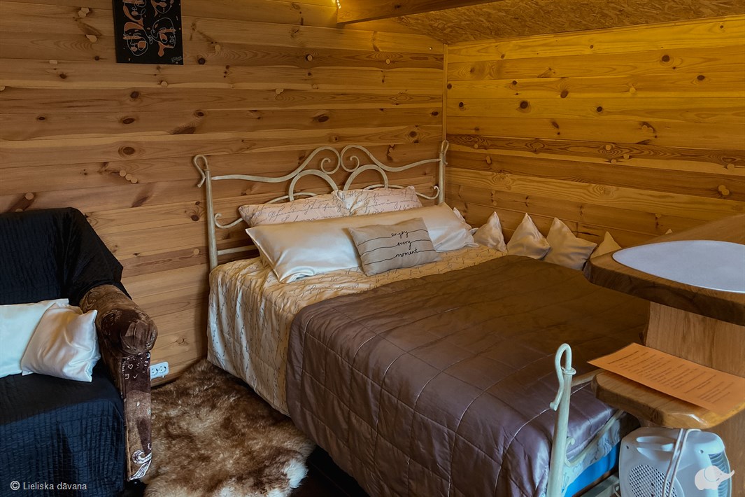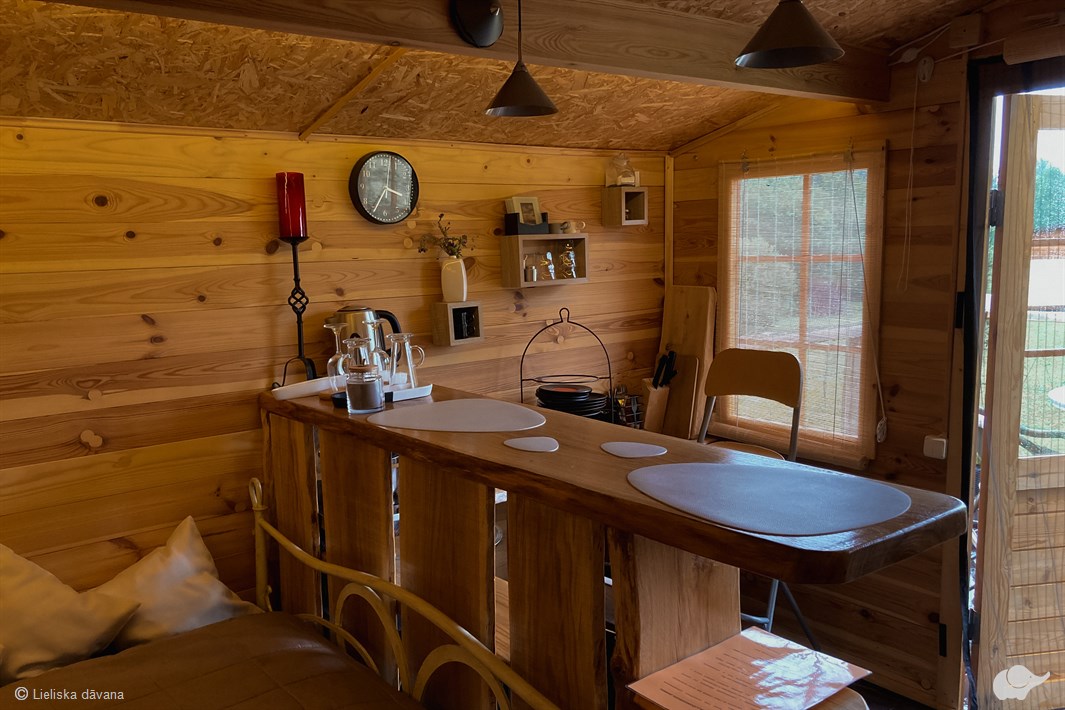 Mājiņā ir divvietīga gulta, dīvāns, krēsli un galds. Mazajā mājiņā ir arī neliela virtuve, kas ir aprīkota ar bāra leti, ledusskapi, kafijas un tējas automātu, traukiem un trauku dvieļiem. Aprīkota ar elektriskiem sildītājiem, tā ļaus baudīt atpūtu arī drēgnākos laikapstākļos. Terasē ir galds ar krēsliem. Āra labierīcības blakus mājiņai.