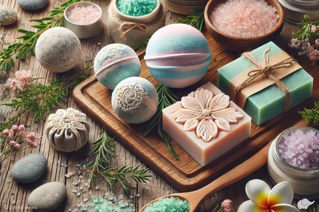 dabīgās kosmētikas komplekta izgatavošana pāru meistarklasē, kopā radot vannas bumbu, ziepes un ķermeņa skrubi no izvēlētajām dabas sastāvdaļām.