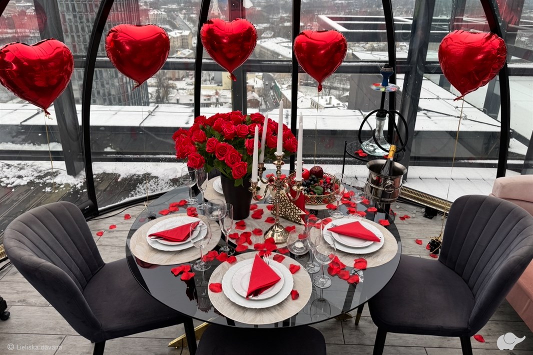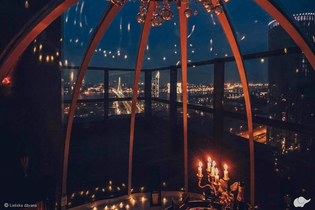 • pusotras stundas atpūta 4 personām apsildāmā un eleganti rotātā iglu namiņā un privāta piekļuve terasei Filozofu Rezidences 23. stāvā;