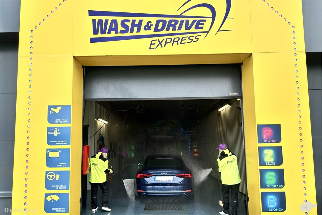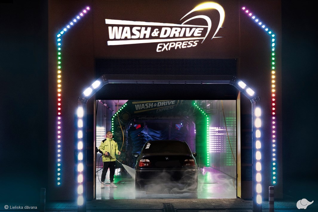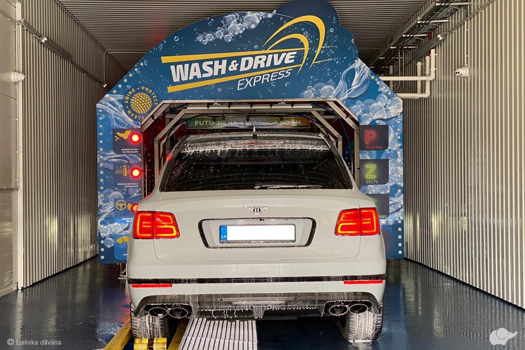 “Wash & Drive Express” automatizētajā mazgāšanas līnijā Rīgā iespējams iegūt mirdzoši tīru auto 3 minūšu laikā. Mazgāšanas laikā vadītājs un pasažieri var baudīt gaismas un putu šovu, pēc tam – iztīrīt salonu jaudīgā putekļsūcēju zonā.